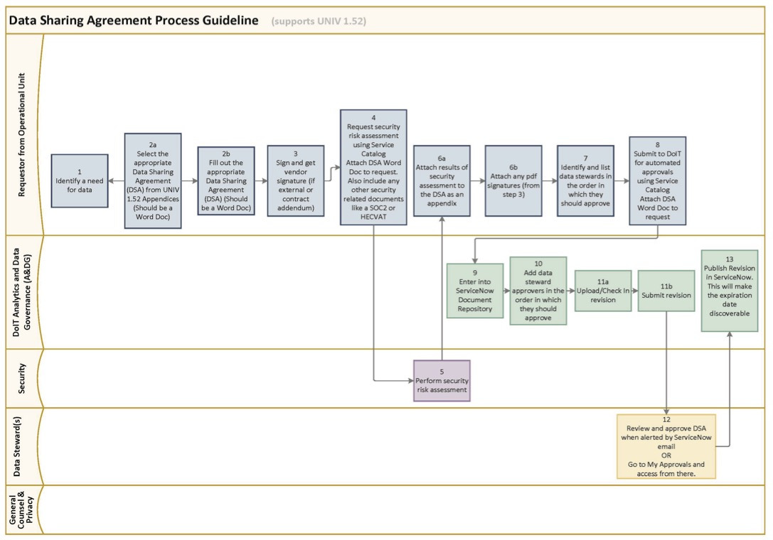A Data Security Sharing Agreement is a data exchange approval process. It focuses on three security-related traits of data, including: data elements, their classifications, and the method of sharing. Departments and Organizational Units (OU) use this process to request data from data stewards.